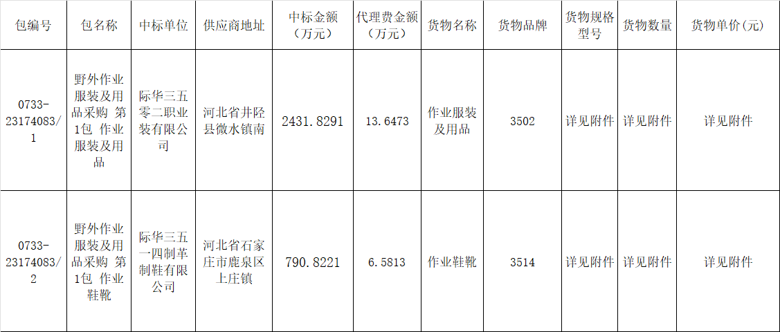 | 1 | 际华三五零二职业装有限公司 | 作业服装及用品 | 3502 | 详见附件 | 详见附件 | 详见附件 |